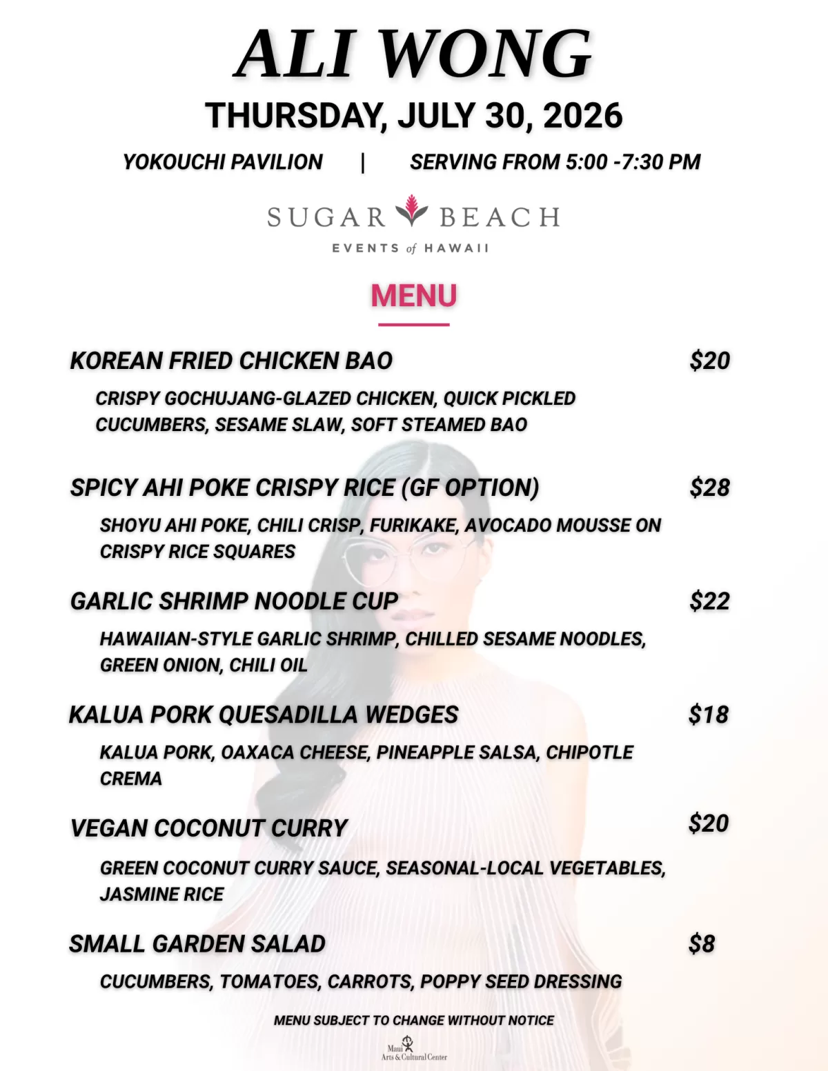Food & Beverages will be available for purchase in the Yokouchi Pavilion from 5:00 - 7:30 PM.