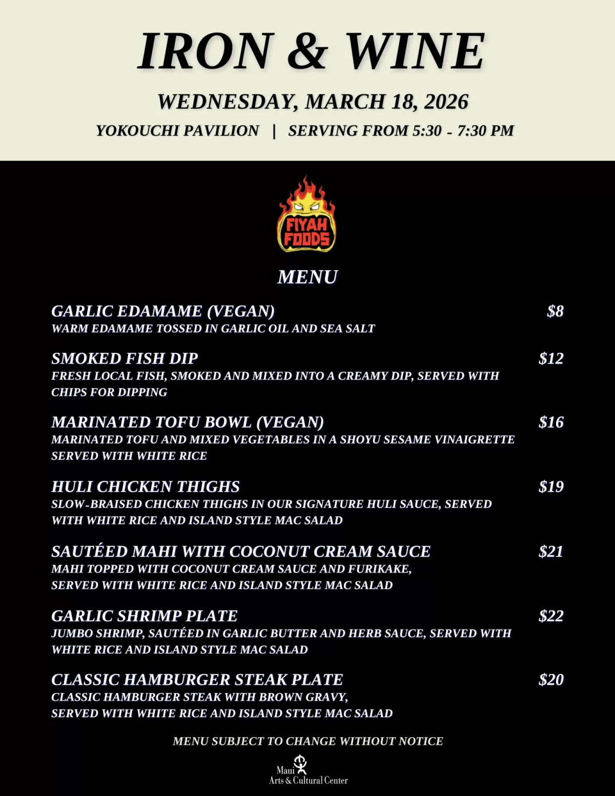 Food & Beverages will be available for purchase in the Yokouchi Pavilion from 5:30 - 7:30 PM.