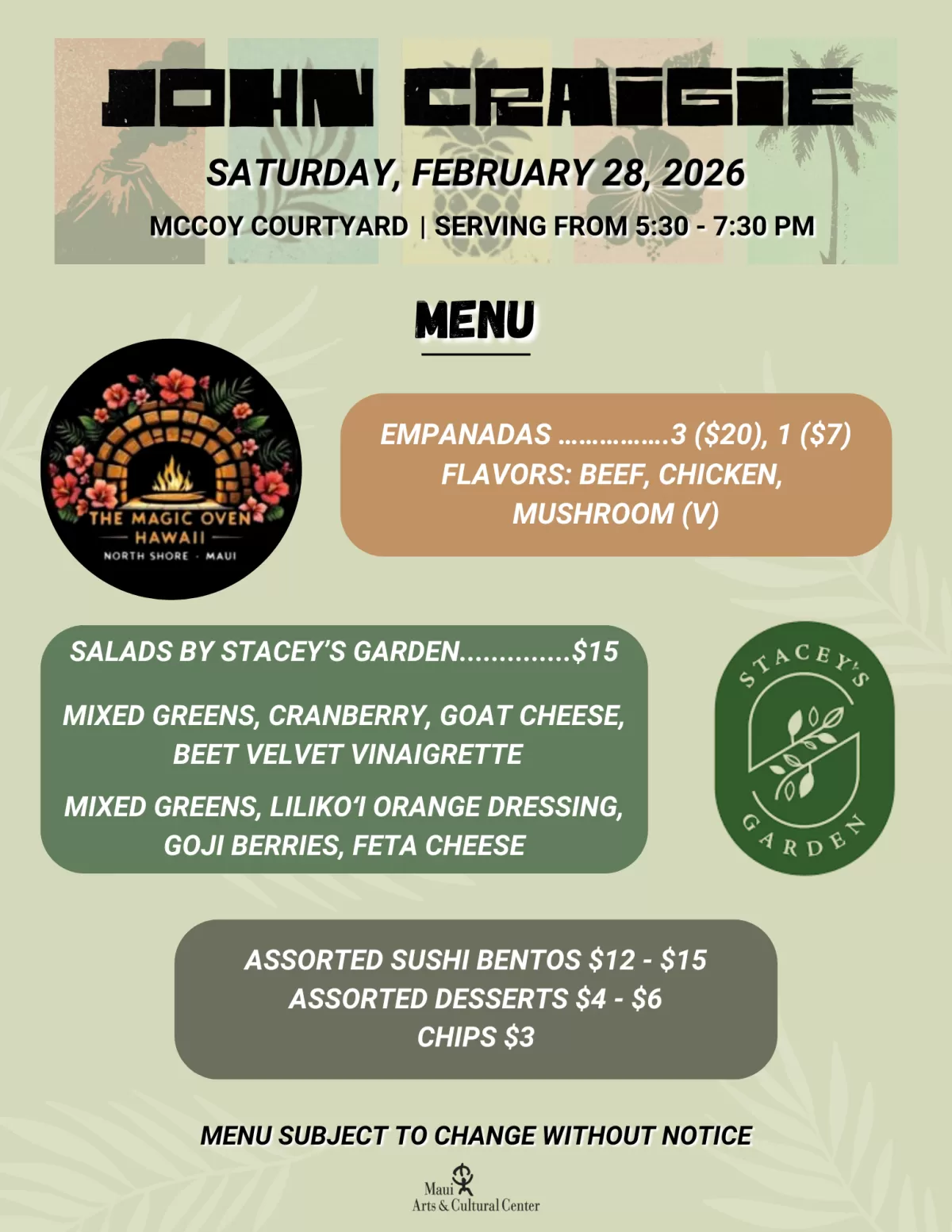 In keeping with the MACC’s dedication to supporting the victims of the wildfires, patrons for this concert are asked to bring non-perishable items for the Maui Food Bank.