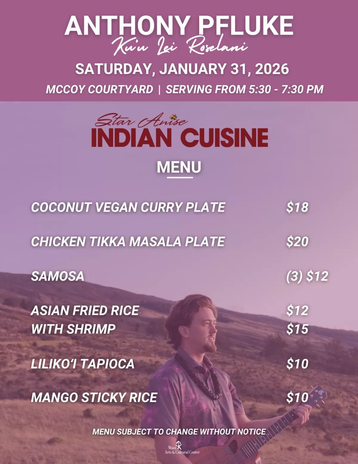 In keeping with the MACC’s dedication to supporting the ongoing needs for victims of the wildfires, patrons for this concert are asked to bring non-perishable items for the Maui Food Bank. As an added incentive, patrons who bring donations will be entered into a drawing to win a signed show poster, a copy of his new CD, and a meet-and-greet with the artist.