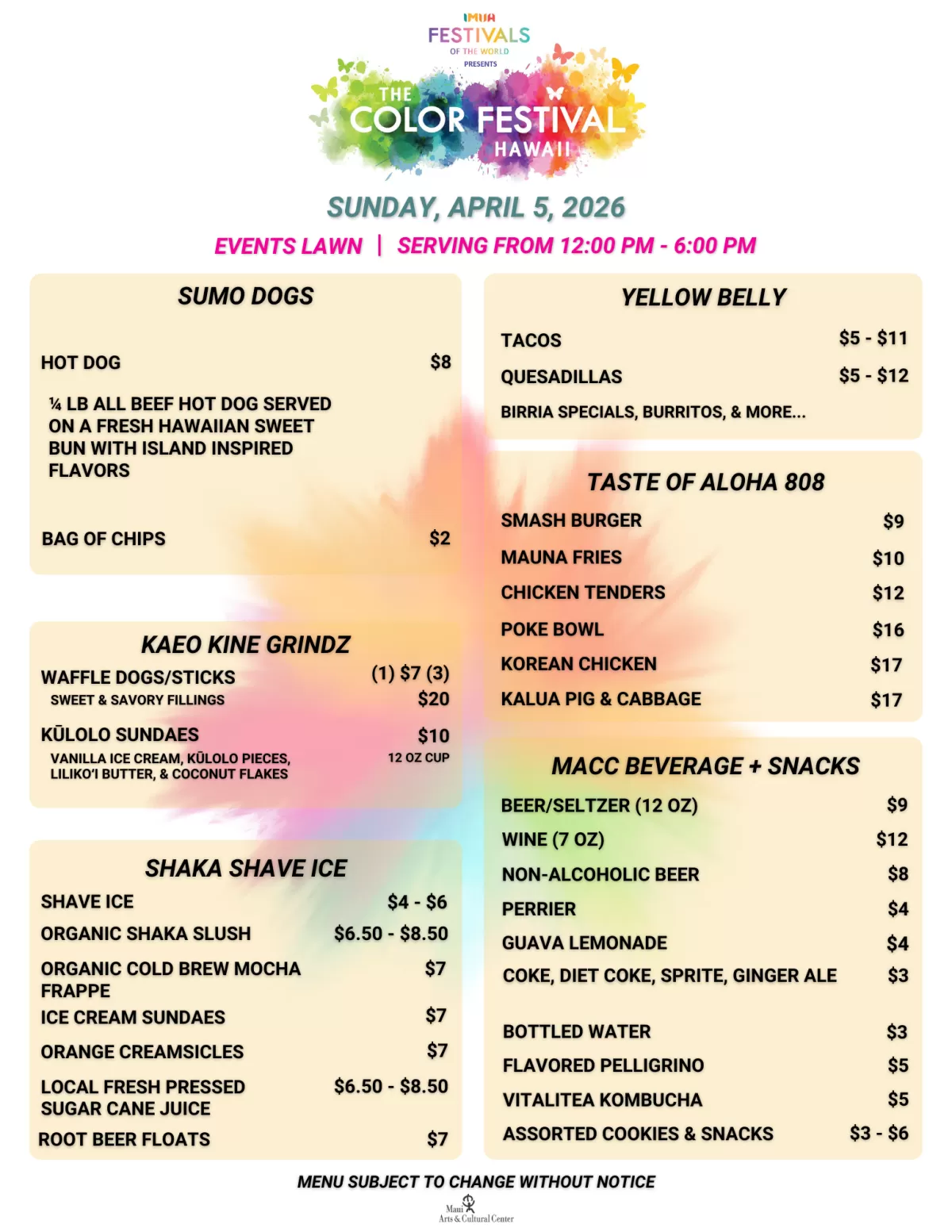 And don’t miss Maui’s best food trucks on-site to provide ono grindz and sweet treats throughout the day, all ending in the exciting throwing of the colors!