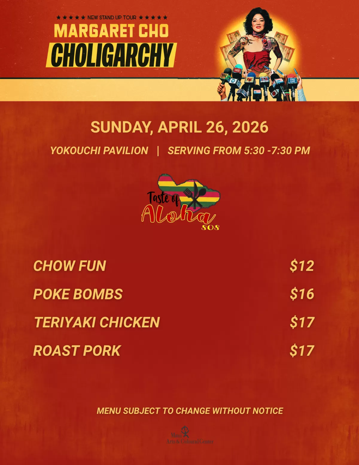 The MACC will be collecting donations for the Maui Food Bank during this event. We ask that our patrons bring non-perishable items for those impacted by the wildfires. Donation bins will be located near the MACC's main entry gates.