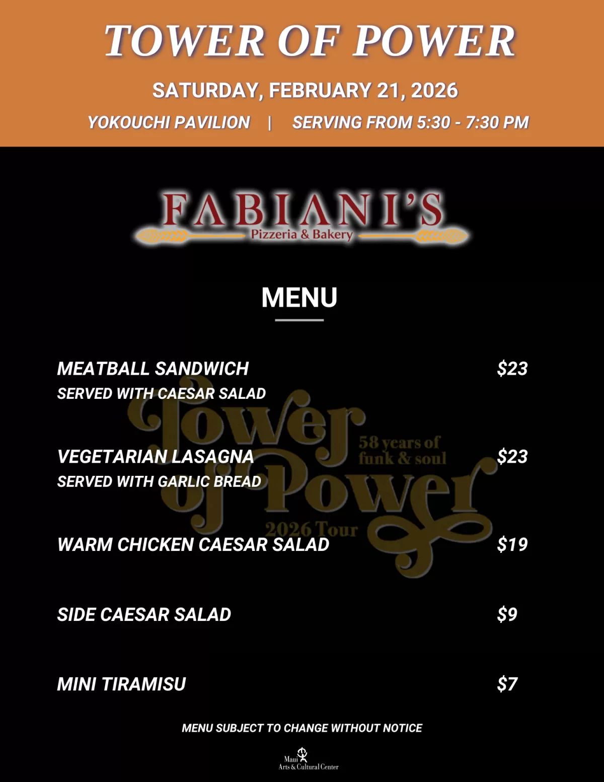 The MACC will be collecting donations for the Maui Food Bank during this event. We ask that our patrons bring non-perishable items for those impacted by the wildfires. Donation bins will be located near the MACC's main entry gates.