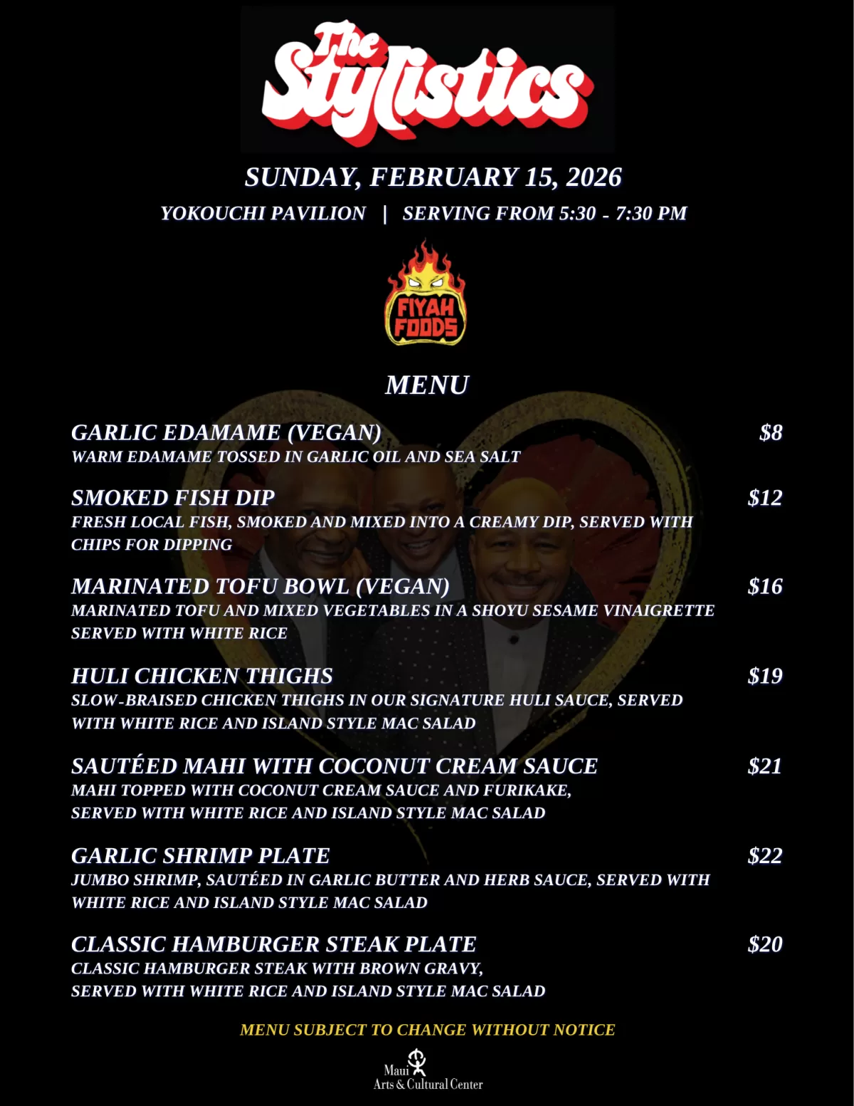 Food & Beverages will be available for purchase in the Yokouchi Pavilion from 5:30 - 7:30 PM.